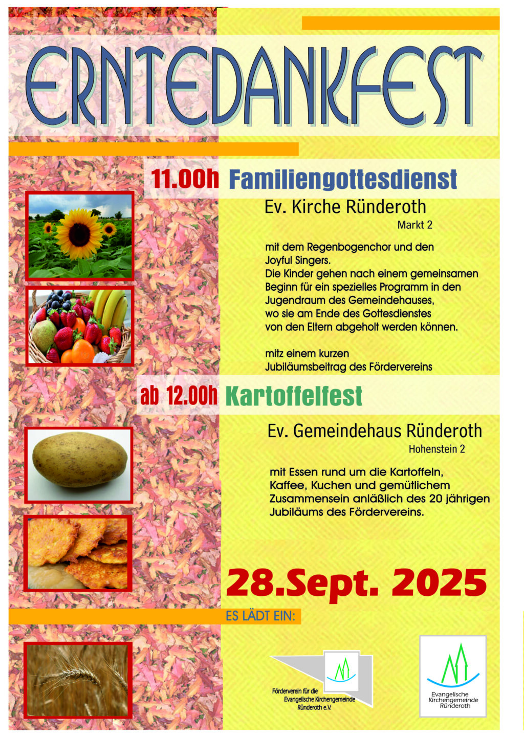 Im Anschluss an den Gottesdienst lädt der Förderverein zu den Jubiläumsfestivitäten zum Kartoffelfest in unser Gemeindehaus in Ründeroth ein.